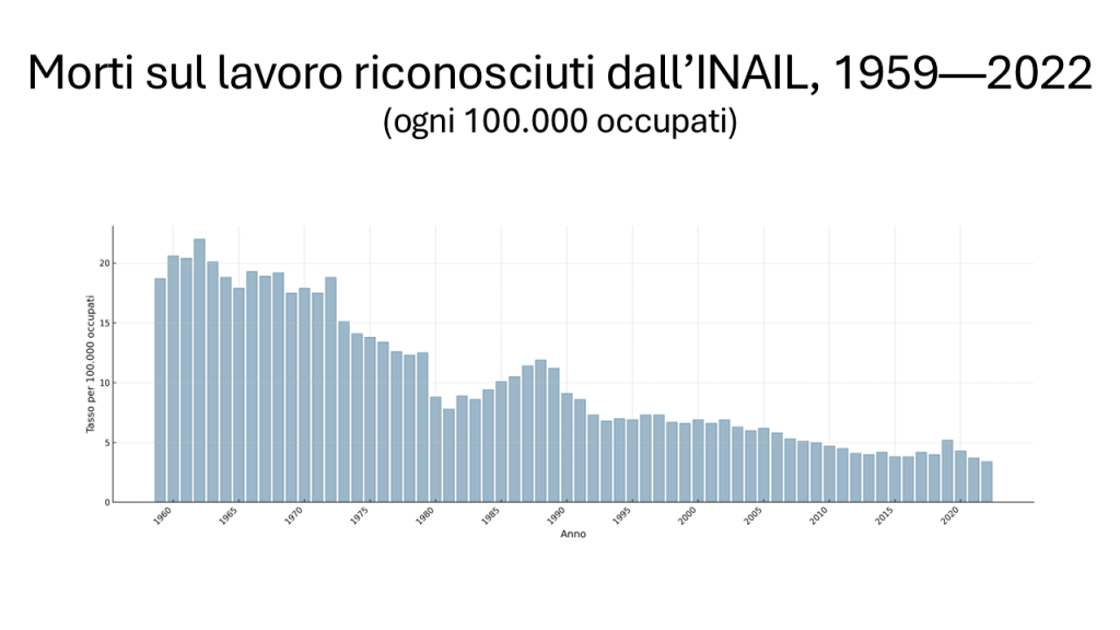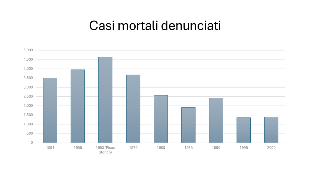 Antonio: I numeri raccontano una parabola lunga. Negli anni Cinquanta e Sessanta morivano sul lavoro più di quattromila persone ogni anno. Nel 1963 il picco: 4.644 vittime, tredici al giorno. Poi, lentamente, la curva è scesa: negli anni Ottanta ancora oltre duemila, nei Novanta meno di duemila, nei Duemila poco più di mille. Oggi siamo attorno alle mille morti all’anno. È un progresso, sì. Ma mille vite perse, ogni anno, restano mille di troppo.