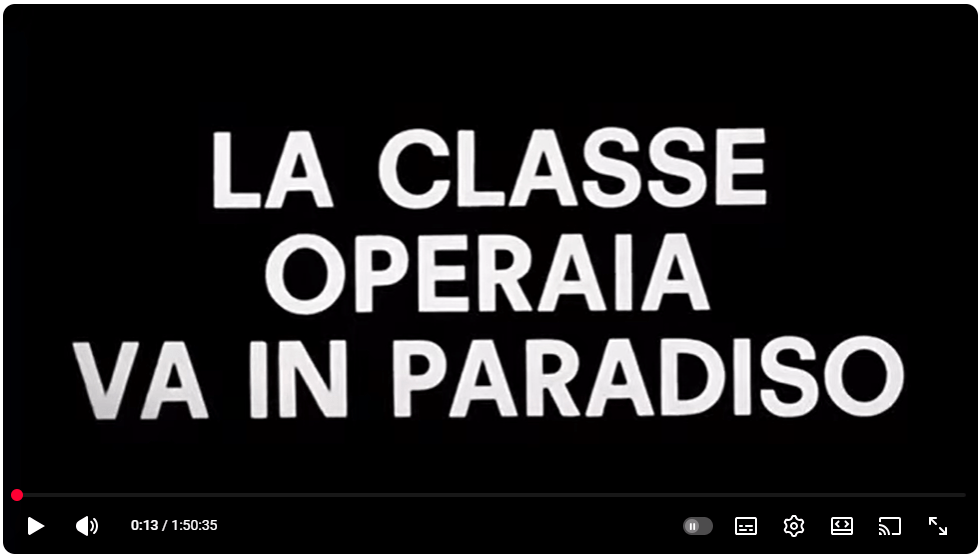 Gilberto: Siamo negli anni Settanta: scioperi, rivendicazioni sindacali, conflitti operai. La fabbrica non è più solo il luogo del sogno di stabilità, ma il teatro della lotta. La classe operaia va in paradiso diventa il simbolo di un’epoca: denuncia, parabola, ritratto di un’Italia che si interroga sul prezzo del lavoro.